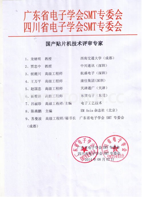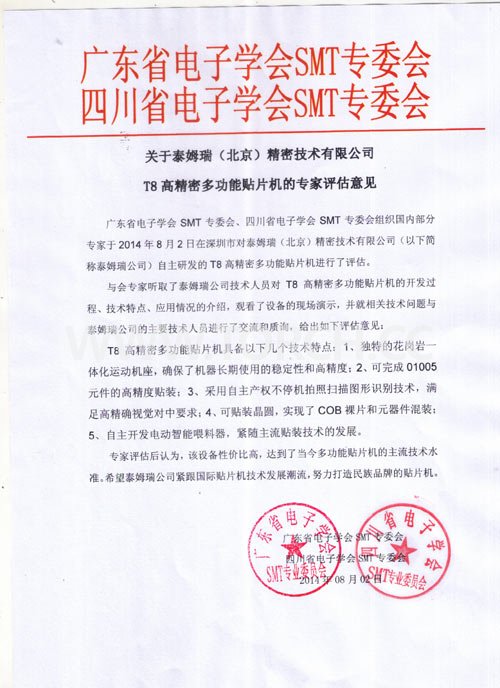 專家評估意見:該設備性價比高,達到了當今多功能貼片機的主流技術水準,希望泰姆瑞公司緊跟國際貼片機技術的發展,努力打造高質量貼片機,成為真正的成長型企業貼片機的品牌。