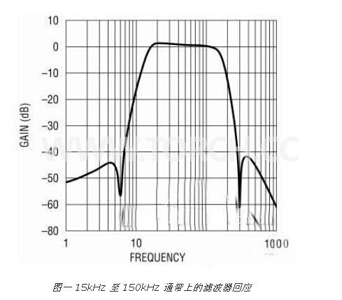低通和高通轉(zhuǎn)角頻率以及濾波器帶寬由頻率頻率的標度比設(shè)定。低通標度比選項為100、300和600,而高通標度比為1000、2000 和6000。圖一顯示一個典型的濾波器回應(yīng),該濾波器具90MHz內(nèi)部頻率,高通和低通標度比分別設(shè)定為6000和600。4階橢圓截止阻帶響應(yīng)有助于消除帶外噪聲。控制基頻帶寬就可以在RFID接收器適應(yīng)工作環(huán)境的過程中,用軟件定義它的工作模式。