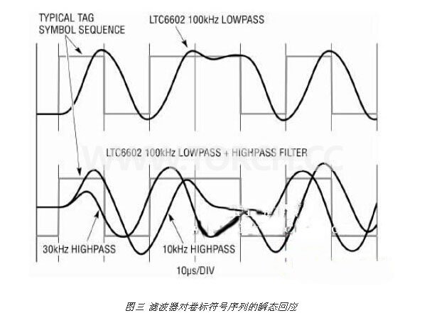 比較具 10kHz 和 30kHz 高通設(shè)置的濾波器輸出,10kHz 輸出的訊號躍變和時間間隔對于檢測符號序列而言是足夠的 (在 RFID 環(huán)境,噪聲將重迭在輸出訊號上)。總的來說,提高低通 fCUTOFF 和/或降低高通 fCUTOFF 意味著,以增大濾波器輸出噪聲為代價“提高”訊號躍變和時間間隔的“質(zhì)量”。