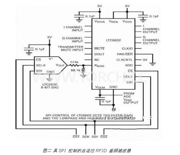可編程讀取器含有一個高線性度的直接轉(zhuǎn)換 I 和 Q 解調(diào)器、若干低噪聲放大器、一個具可變增益和帶寬的雙信道基頻濾波器、以及一個雙信道模擬數(shù)字轉(zhuǎn)換器(ADC)。雙通道、已匹配和可編程的帶通濾波器 LTC6602 可以優(yōu)化高效能 RFID 讀取器。