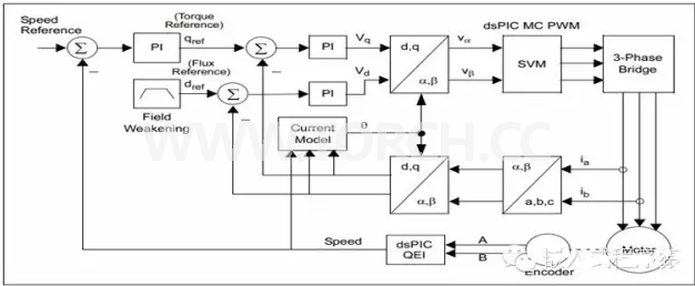 許多芯片MCU,MPU廠商都給出了變頻矢量控制的框圖和算法庫,有興趣的可以研究研究,例如下圖為微芯科技(Microchip)給出的框圖