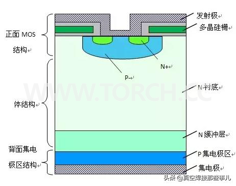 IGBT(真空共晶爐)芯片在結構上是由數萬個元胞(重復單元)組成,工藝上采用大規模集成電路技術和功率器件技術制造而成[2]。每個元胞結構如下圖2所示,可將其分成體結構、正面MOS結構及背面集電極區結構三部分。
